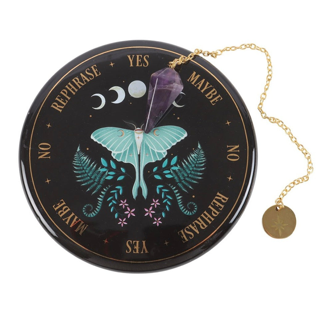 Discover the art of divination and get guidance to life questions with this enchanting pendulum divination kit. Containing a ceramic dish with a mystical luna moth design and a crystal pendant, this beautiful set is perfect for beginners and experienced soothsayers alike.